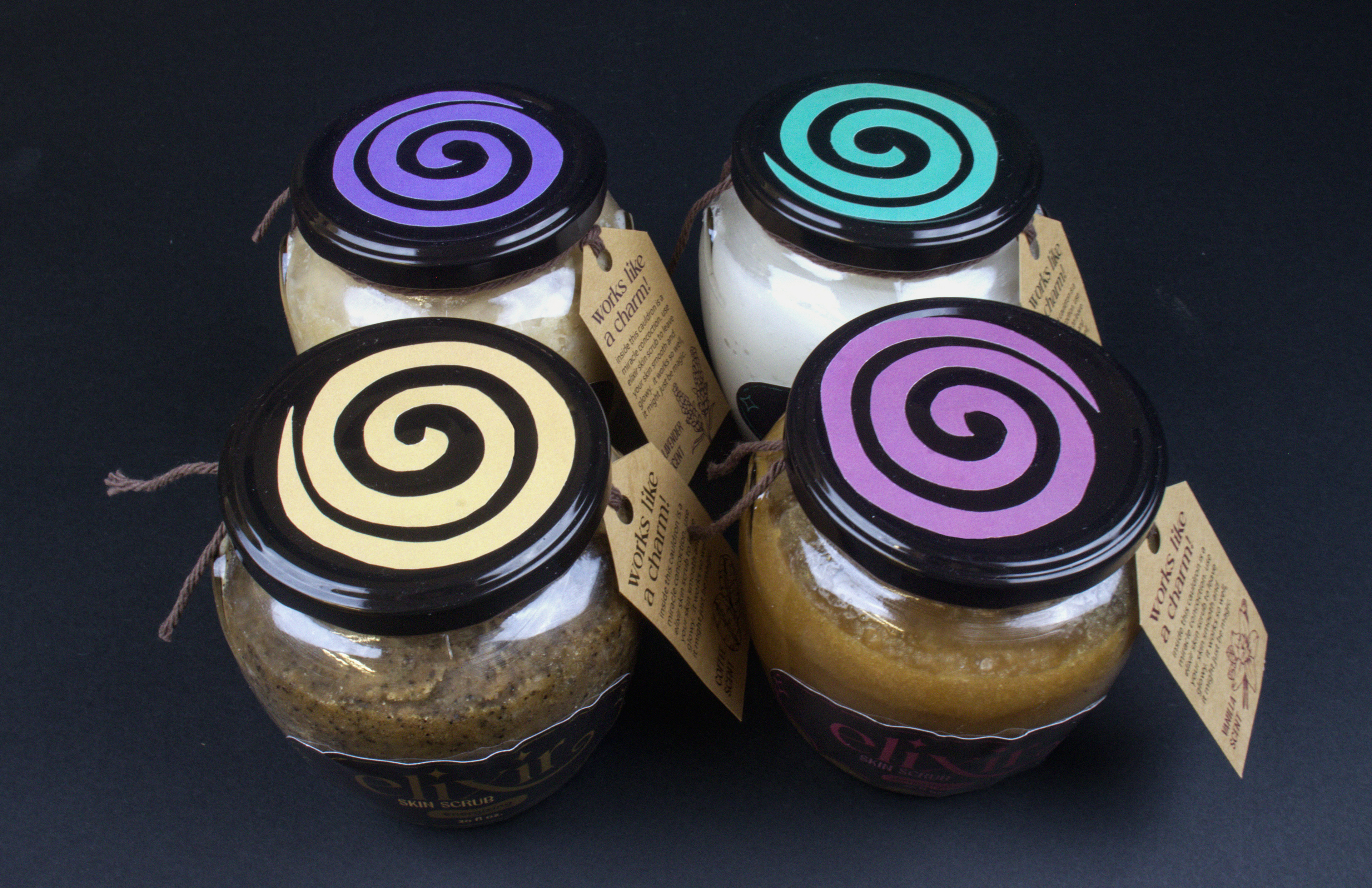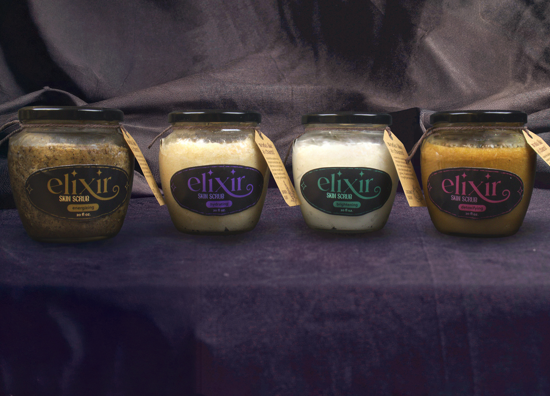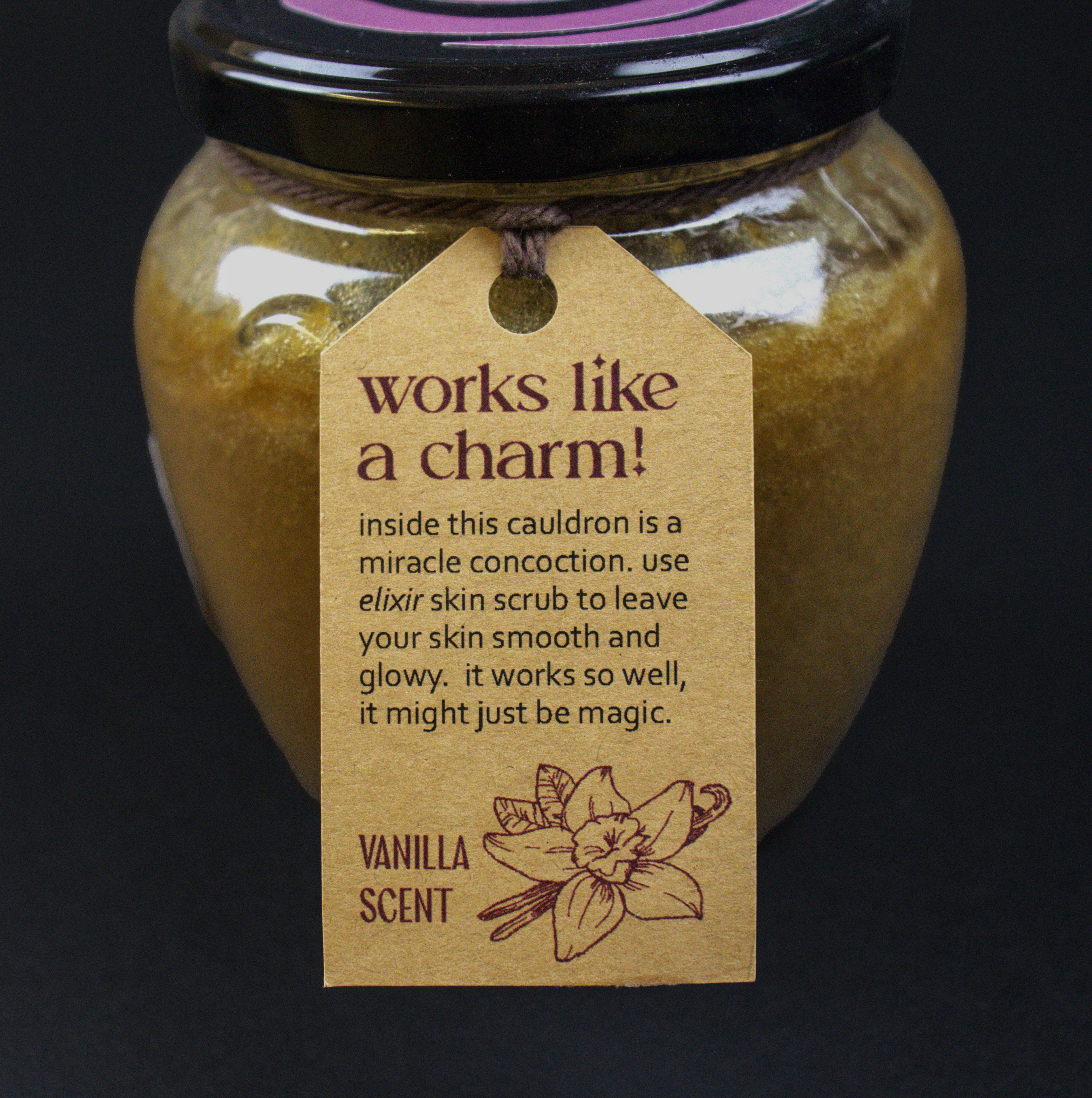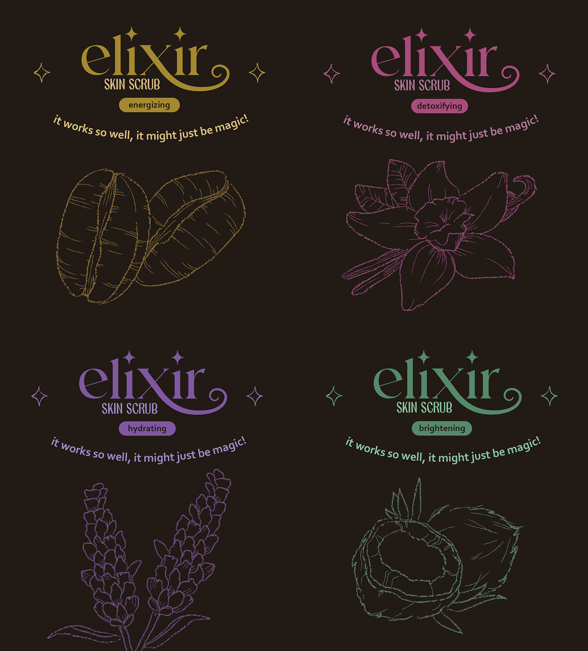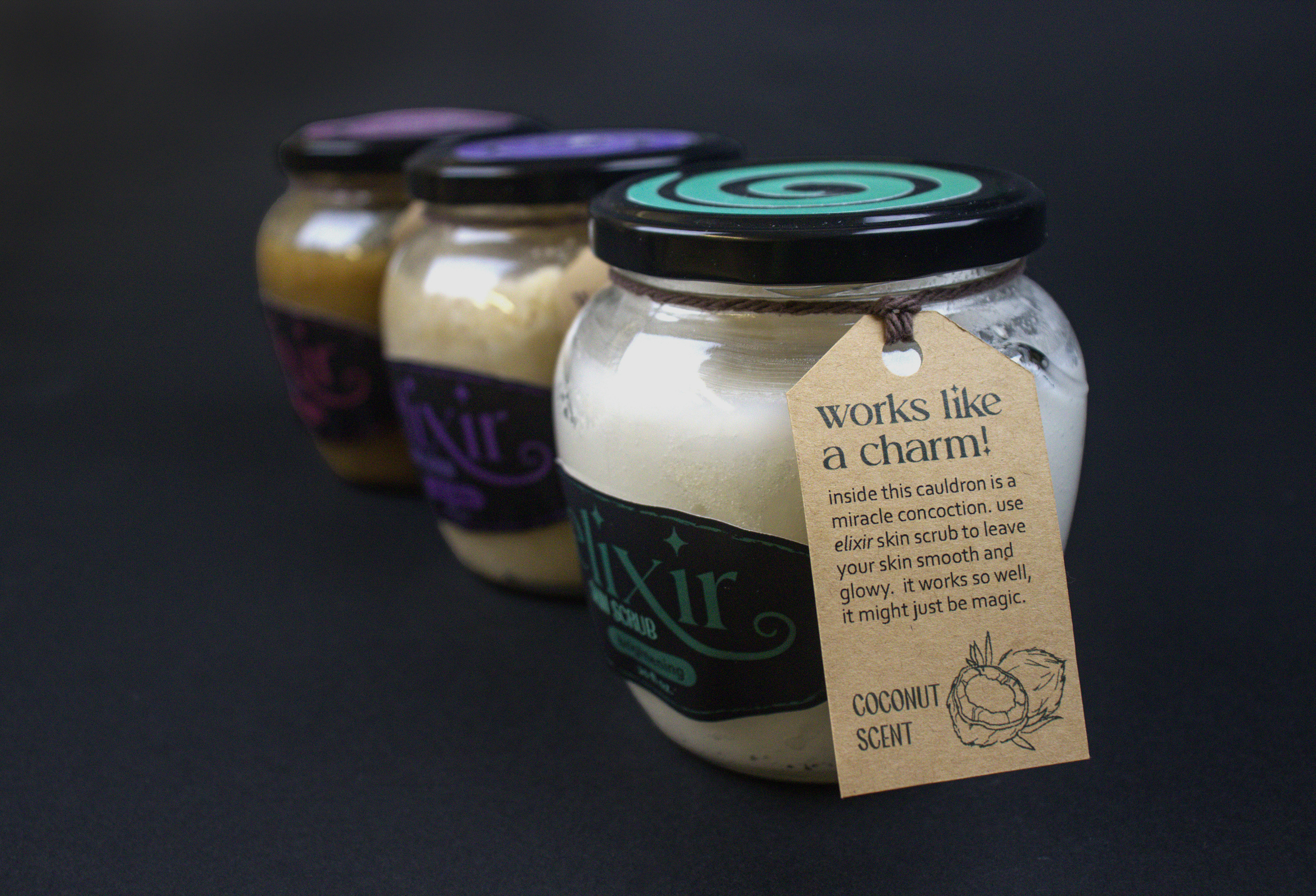 elixir skin scrubs is a skincare product that works so well, it might just be magic. This witchy-themed packaging provides an alternative to clean-aesthetic skincare while utilizing a cohesive color palette, language, and overall feel.