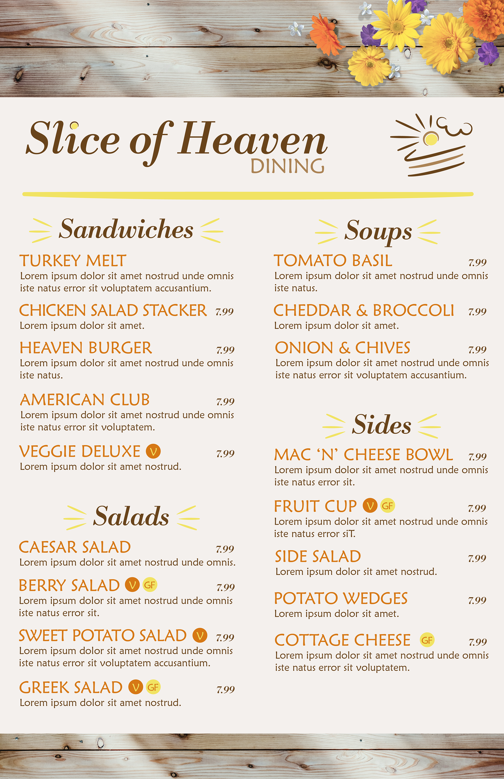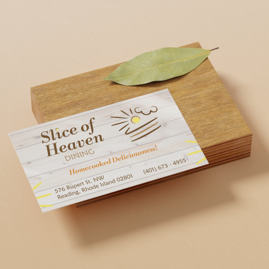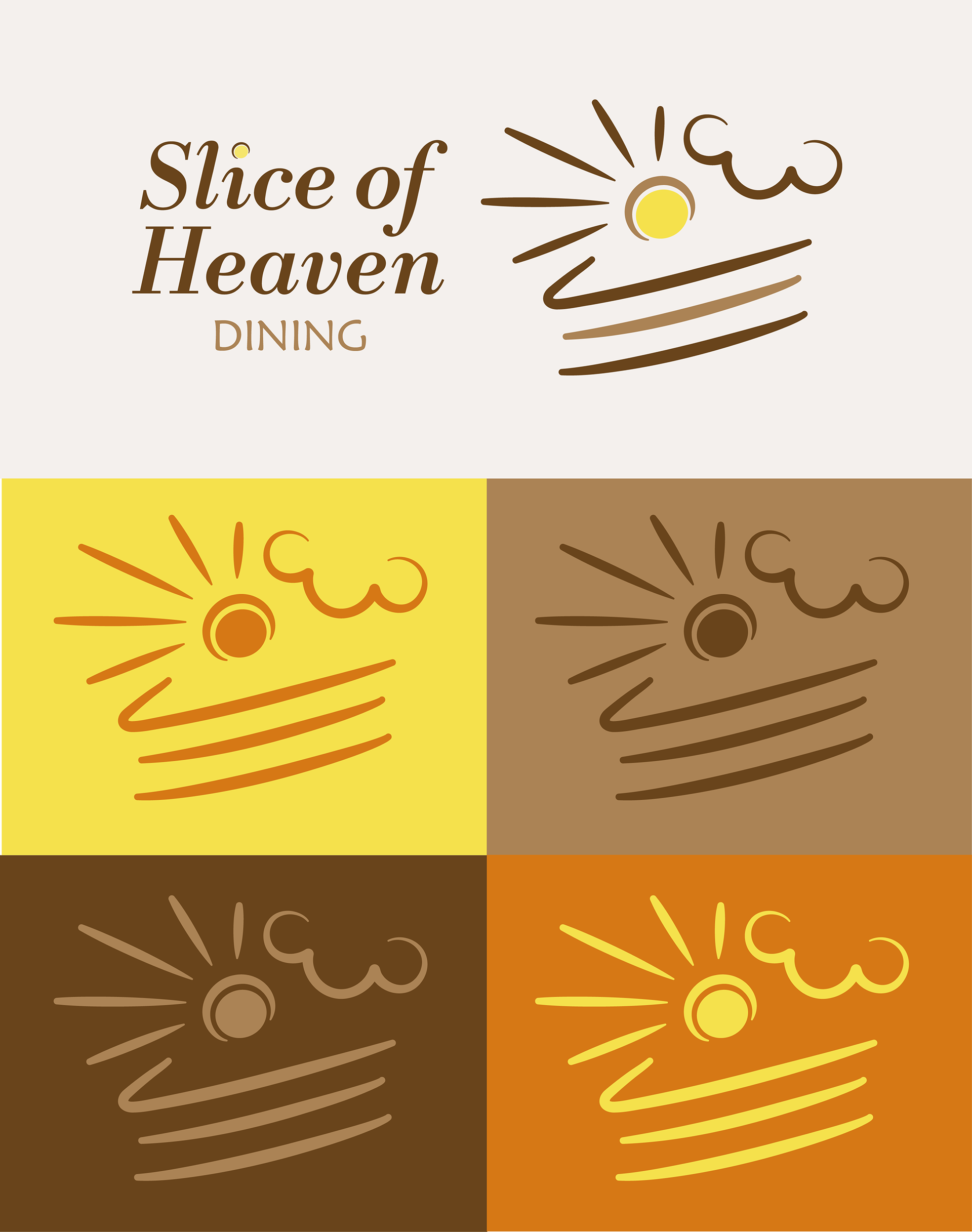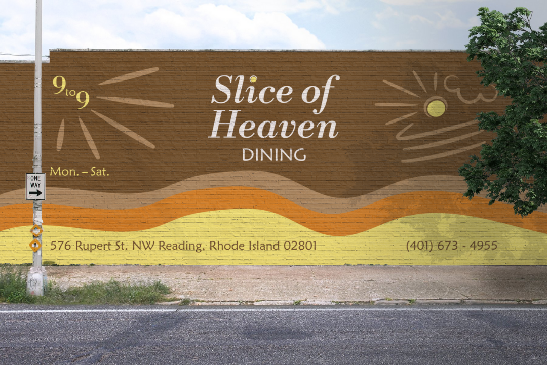 Slice of Heaven Dining is a proposed restaurant concept. The restaurant's food mimics delicious homecooked meals. The brand’s friendly and cozy feel is evoked with a warm color palette. The restaurant's logo doubles as a slice of pie and an abstract representation of the heavens, a nod to the restaurant’s name.